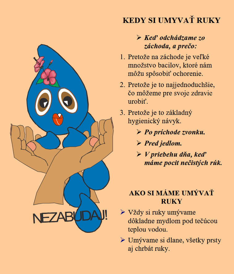 Aby ste ochránili seba aj svojich blízkych, je nevyhnutné dodržiavať správnu hygienu rúk, teda dôkladne si umývať ruky mydlom a teplou vodou. Vždy po použití toalety, príchode zvonku, pred jedlom, alebo aj v priebehu dňa, keď máte pocit nečistých rúk.