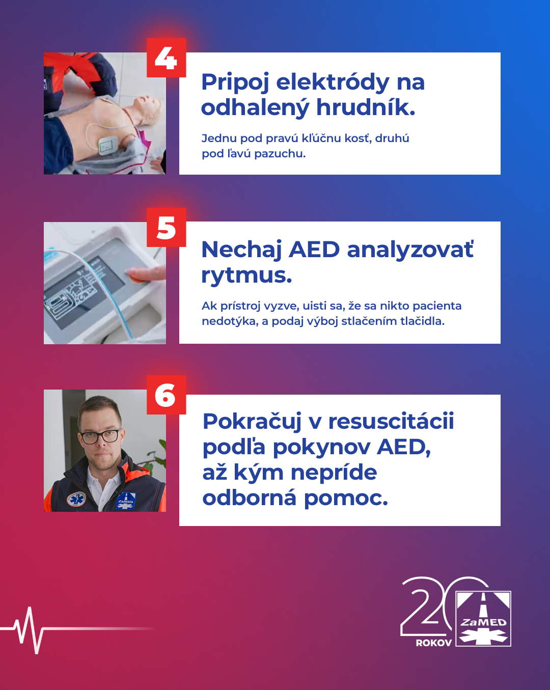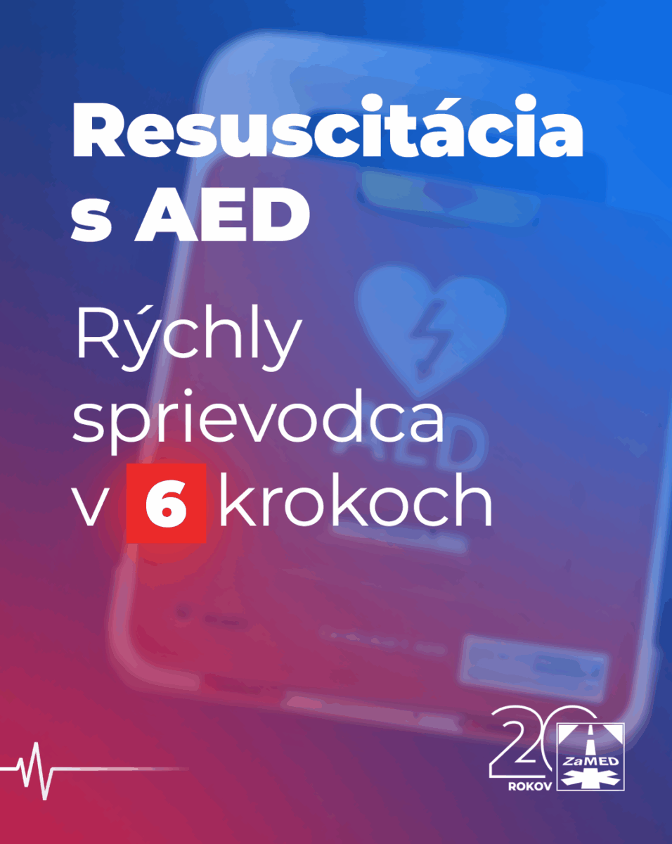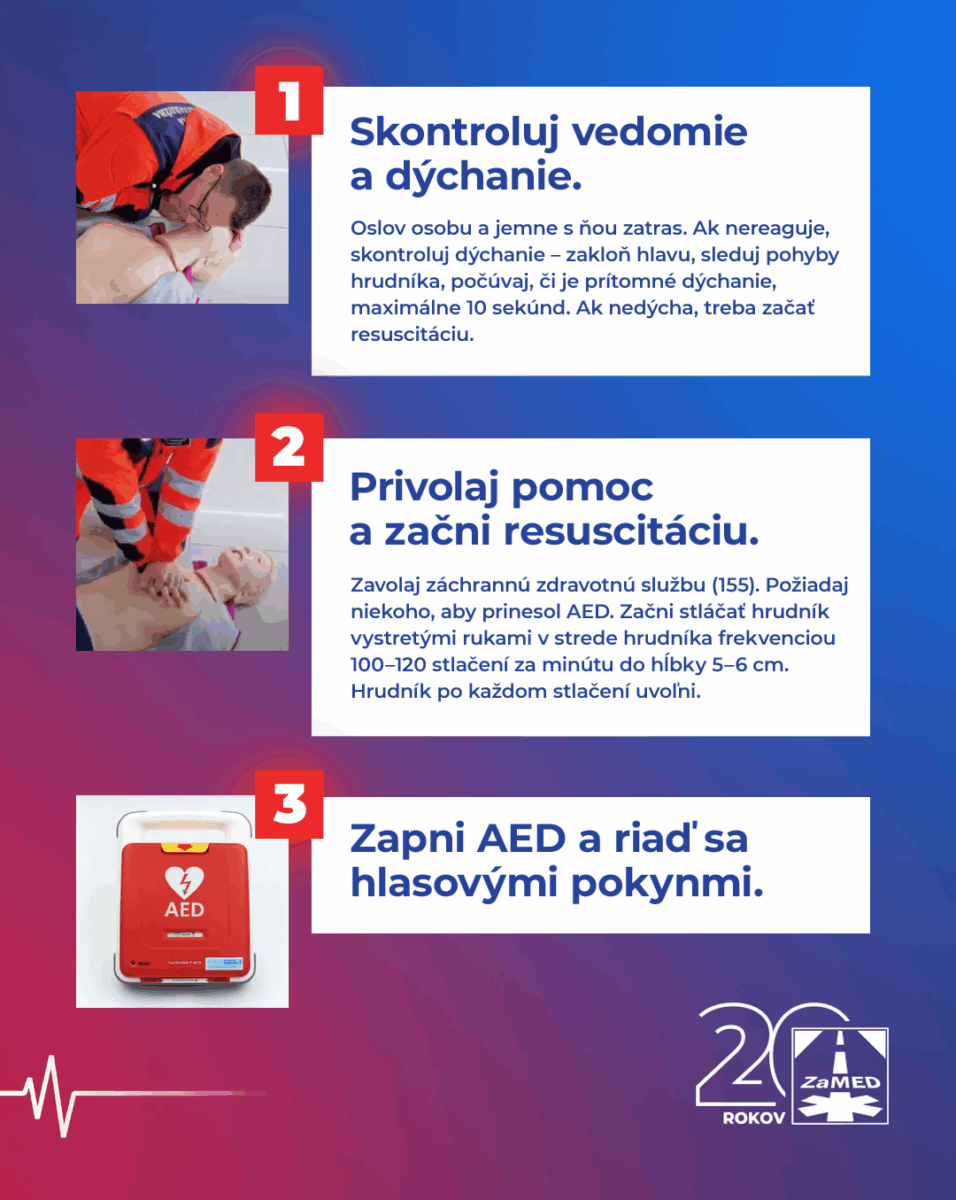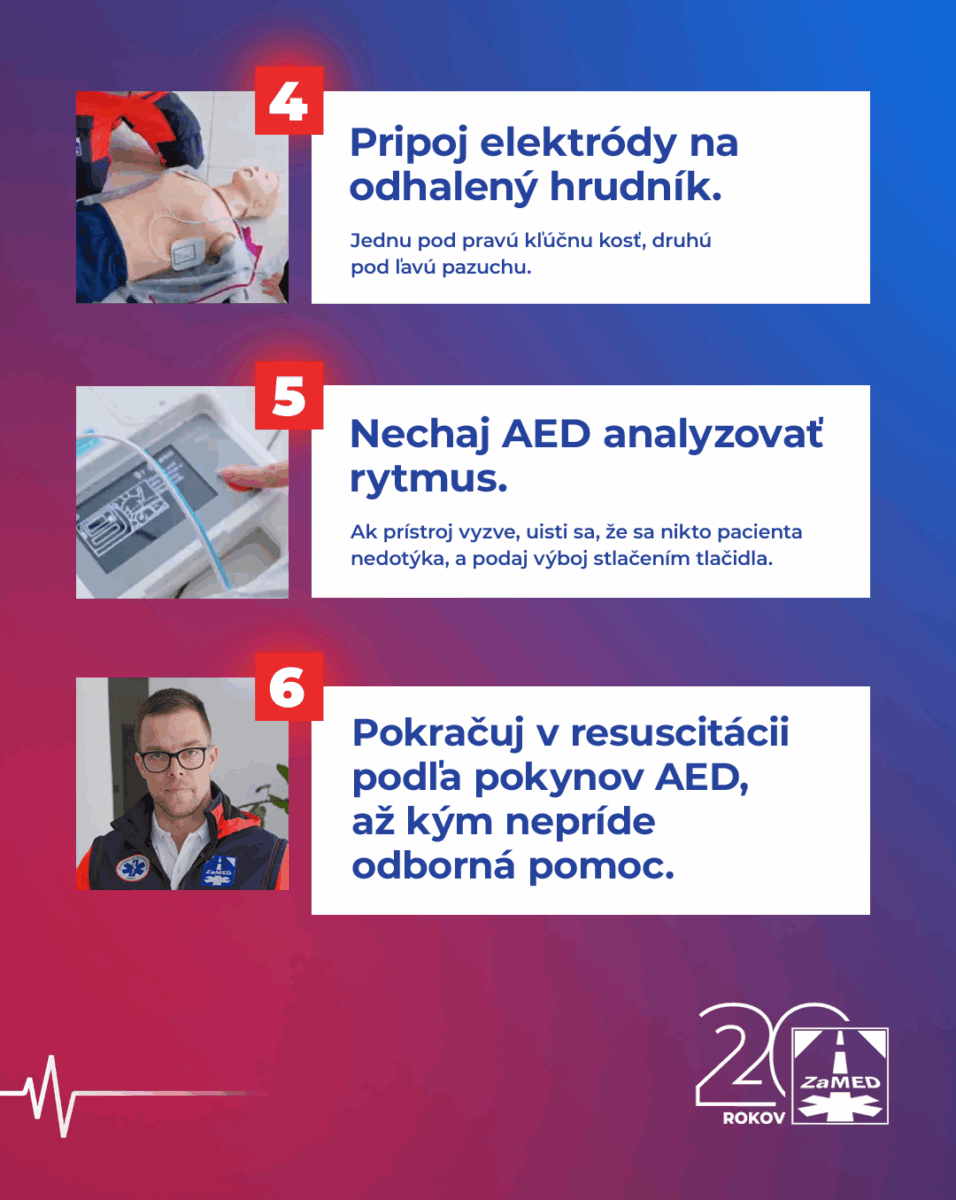 V infografikách Vám prinášame praktický návod na poskytnutie prvej pomoci s použitím AED.